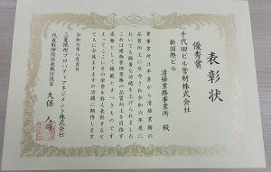 新国際ビル事業所において、2024年度清掃業務の功績を認められ優秀賞を授与されました。