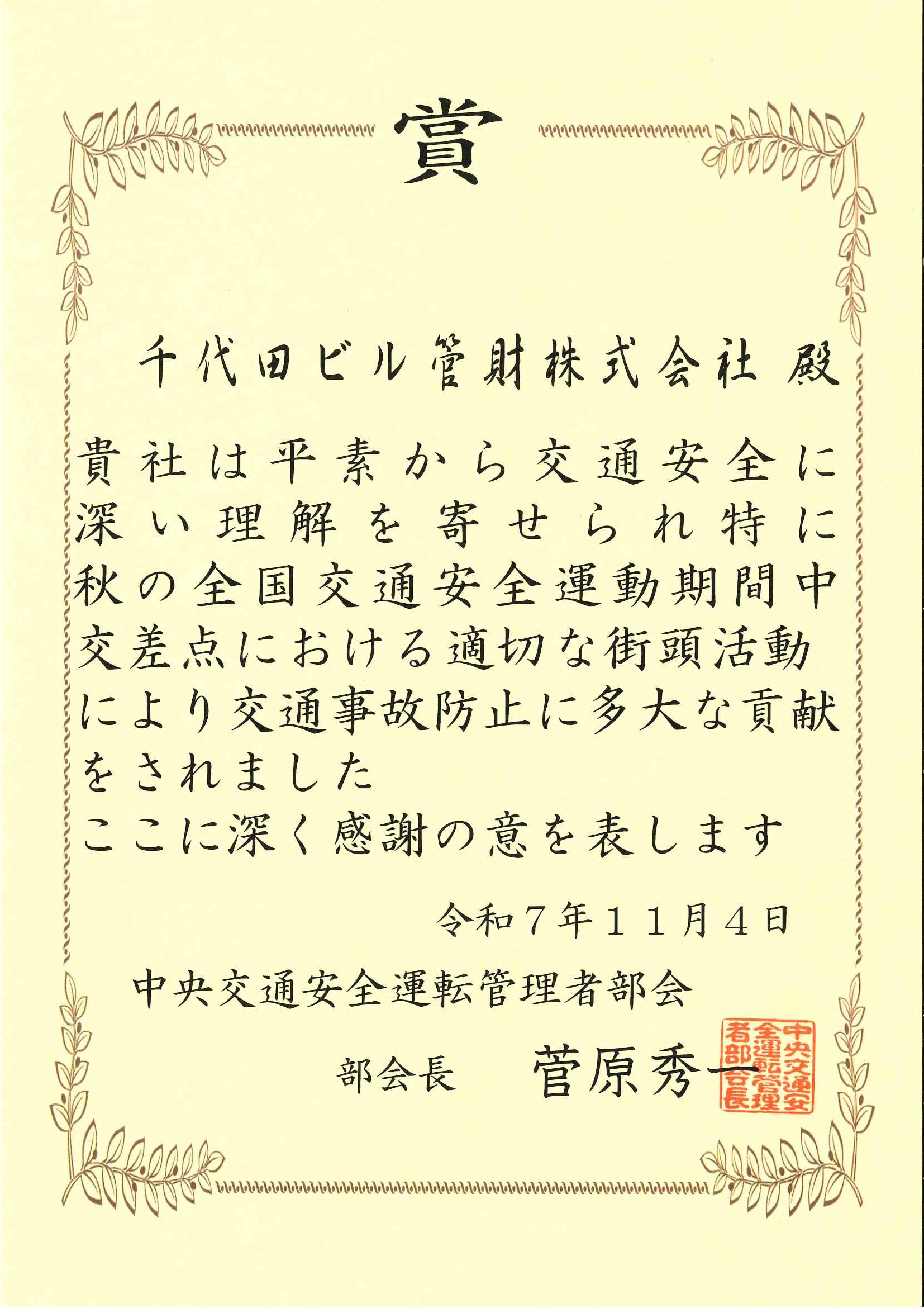 中央交通安全協会より表彰されました 2025年11月04日 お知らせ 11月4日に中央交通安全協会より秋の全国交通安全運動において適切な街頭活動を行い交通事故防止に貢献したとし表彰されました。 一覧へ戻る